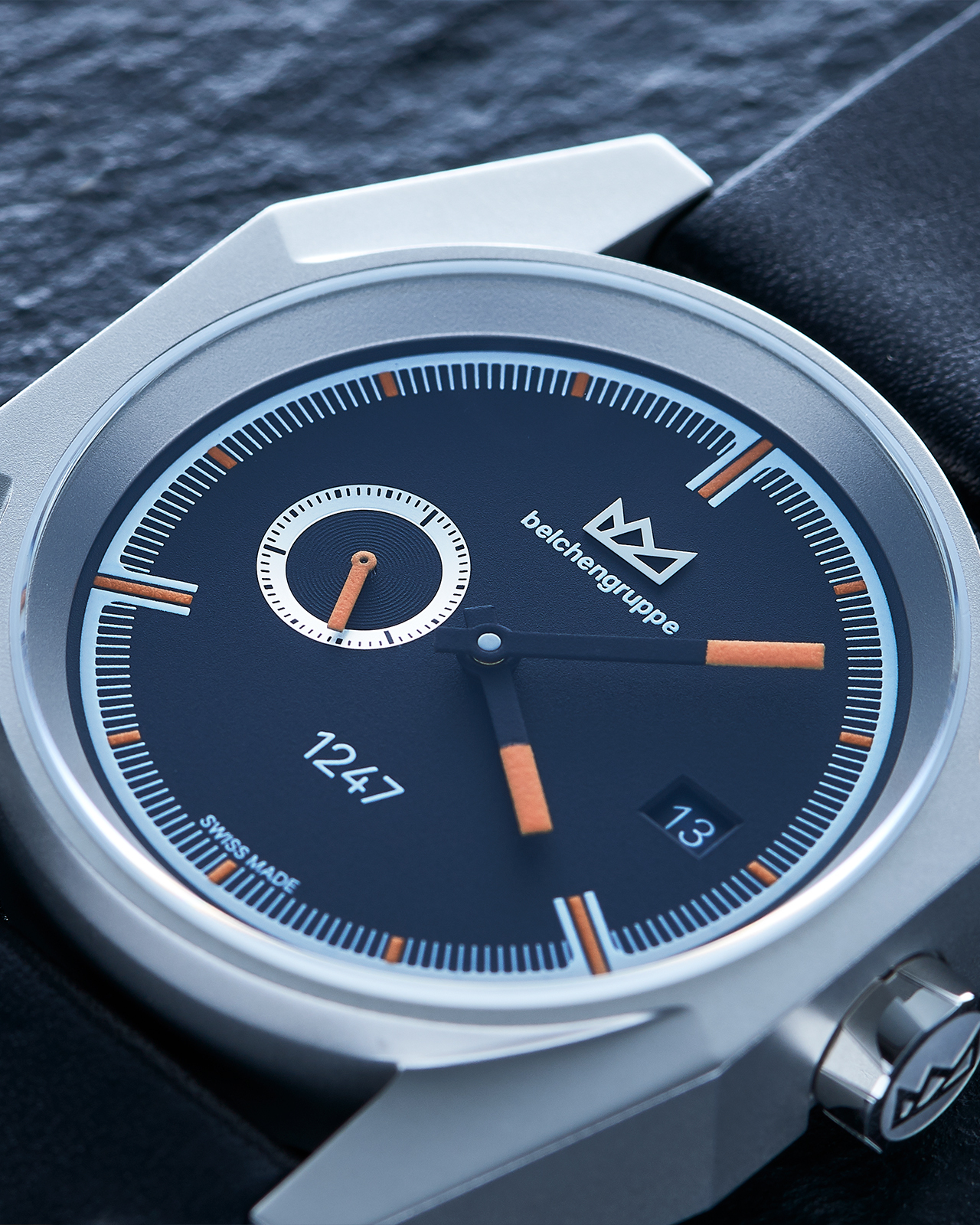 An automatic calibre SW290-1 ticks in the 1247 120°. The date ring is exclusively printed with the Belchen Grotesk font, the Belchengruppe's house font. With 31 jewels, Incabloc shock protections and a frequency of 28'800 A/H (4 Hz), it has a power reserve of at least 38 hours.