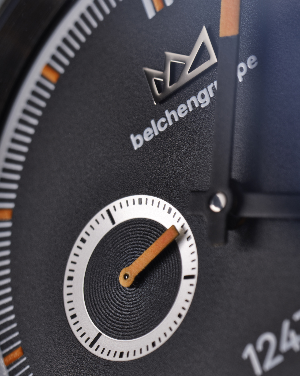 Un calibre automatique SW290-1 tourne dans le 1247 120°. L'anneau de date est imprimé exclusivement avec la police Belchen Grotesk, la police maison de Belchengruppe. Dotée de 31 rubis, de protections antichoc Incabloc et d'une fréquence de 28'800 A/H (4 Hz), elle dispose d'une réserve de marche d'au moins 38 heures.